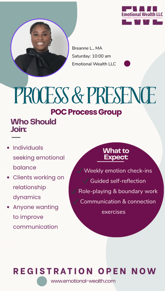 Process & Presence is a dedicated support space for people of color (POC) to explore emotional wellness, deepen self-awareness, and strengthen interpersonal relationships. This ongoing process group provides a safe and affirming environment where participants engage in weekly check-ins, guided self-reflection, and interactive role-playing exercises.